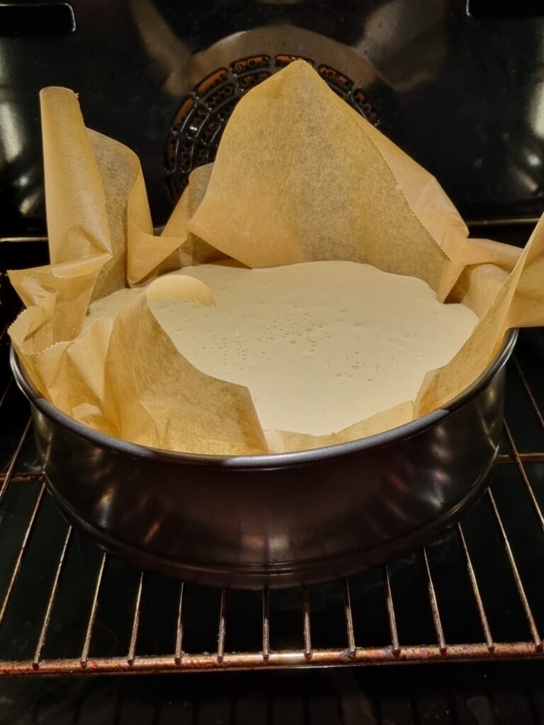 - Sett formen i en større langpanne og fyll ca. 2–3 cm vann i pannen – dette lager et vannbad som gir kaken ekstra kremet konsistens.