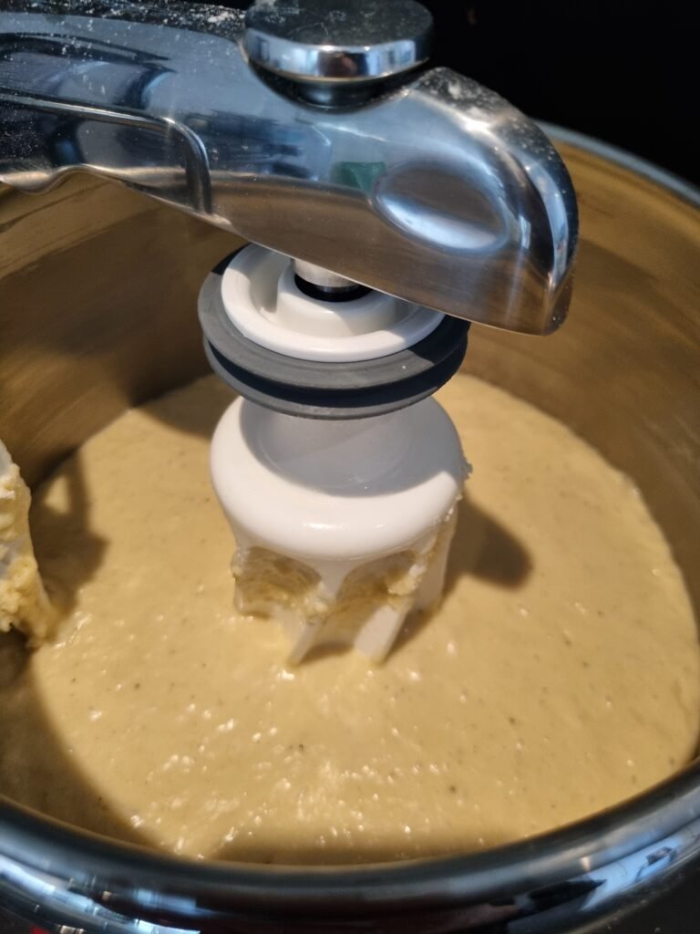 Bare å innrømme at jeg ikke klarte å følge oppskriften. Lurer du på hva som skjer viss du bare tar oppi den siste skvetten som er igjen i melkekartongen oppi deigen? Da har jeg svaret til deg, det blir en deig som ligner mer på en saus. Følg oppskriften så skal det gå bra.
