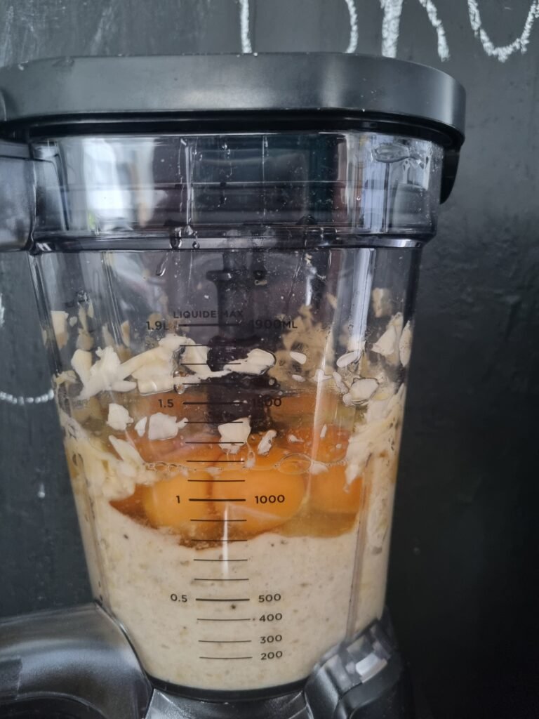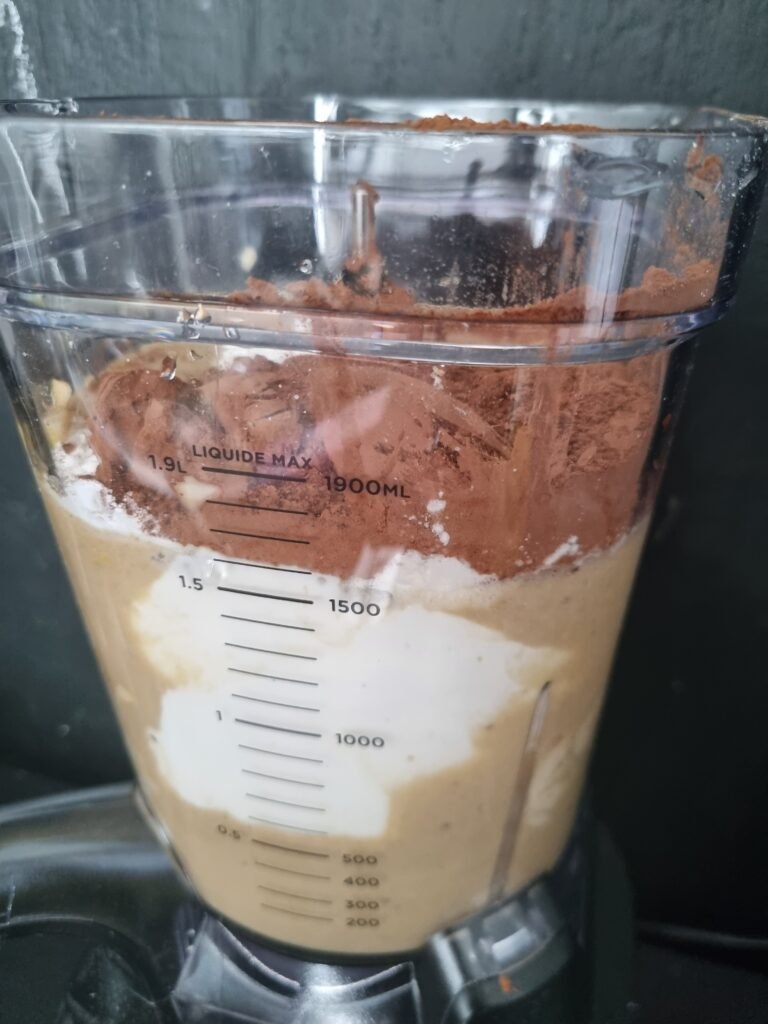 - Tilsett egg, yoghurt og kakao, og eventuelt honning og bakepulver. Rør til du får en jevn og glatt røre. Eller kjør alt i en kickass blender. Ja, jeg har kjøpt meg ny, stor, flott blender 🙂