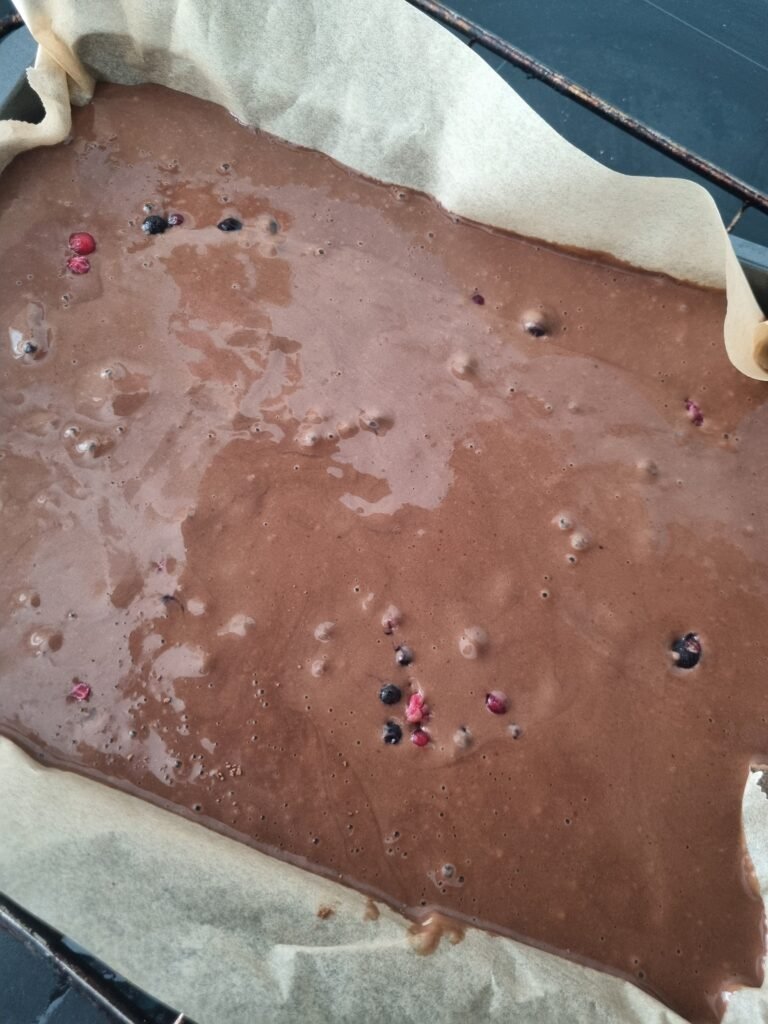 - Legg i bakepapir i formen og hell røren