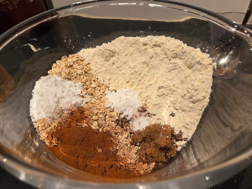Bland inn havregryn, havremel, bakepulver, kanel, vanilje og salt.