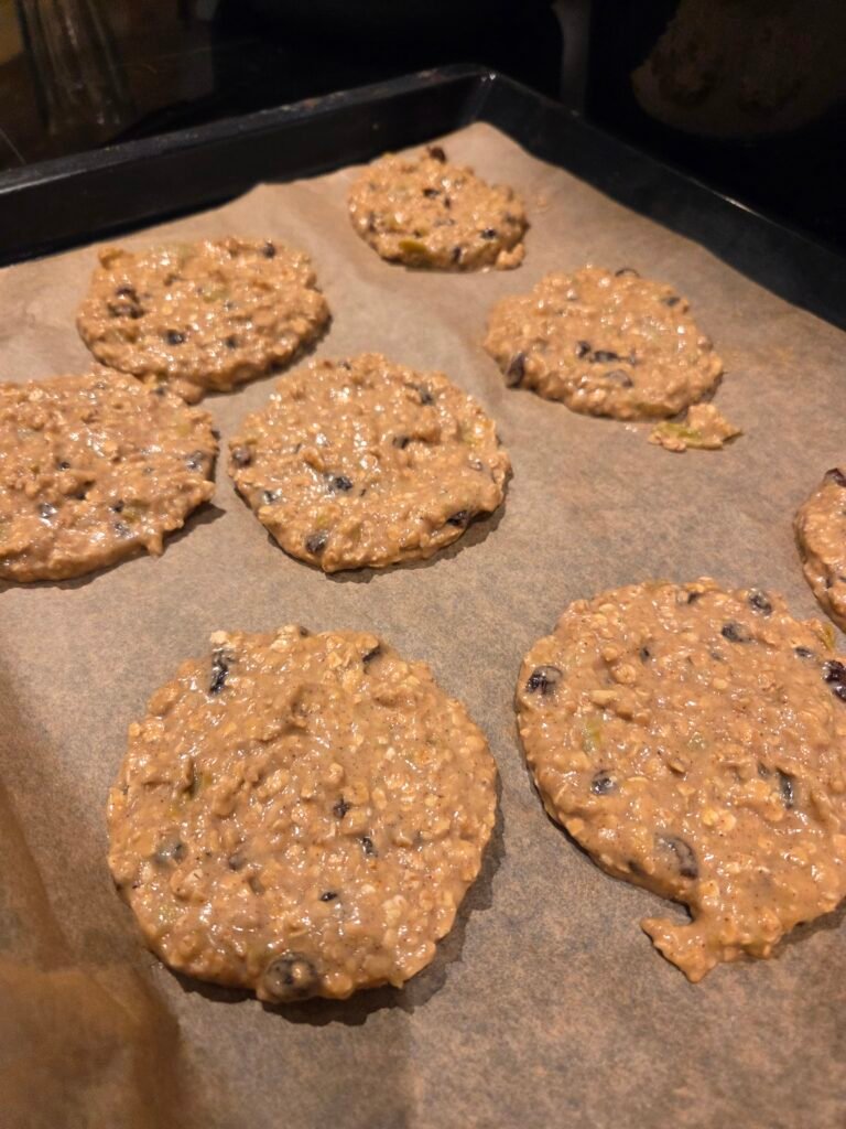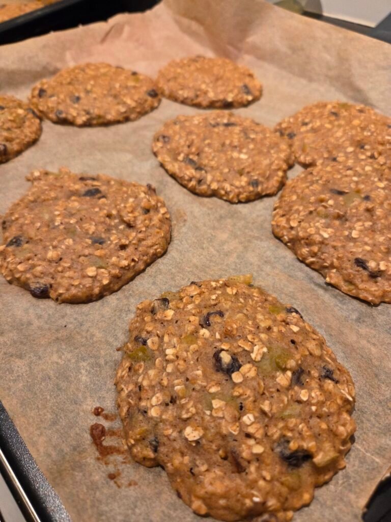 Det er noe veldig tilfredsstillende med å kunne bake cookies og vite at de faktisk er snille mot kroppen. Ikke bare «litt mindre usunne», men på ordentlig laget av ting som gir metthet, fiber og naturlig sødme. Denne gangen var utgangspunktet helt enkelt. Jeg hadde en stor boks hjemmelaget eplemos i kjøleskapet og lyst på noe søtt til kaffekoppen. Ikke kake. Ikke dessert. Bare noe mykt, lunt og litt koselig.
