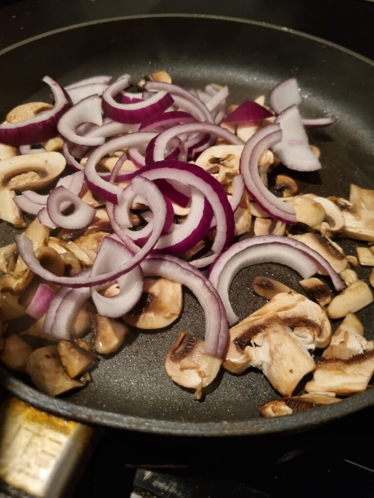 Toppingen er enkel, men utrolig god: sopp, paprika og litt ekstra ost. Soppen gir en fyldig umamismak, paprikaen gir sødme og crunch, og osten binder det hele sammen. Dette er en skikkelig digg hverdagsrett som både er rask å lage og lett å like.