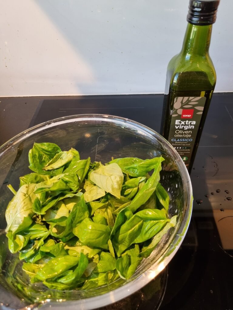 Fremgangsmåten er enkel. Jeg river bladene i grove biter, legger dem i en brødpose og heller på en liten skvett olje. Ca 2 spiseskjeer pr 7 desiliter. Deretter lukker jeg posen godt og legger den rett i fryseren. Når jeg senere trenger basilikum, tar jeg posen ut og bruker en brødkniv til å “spikke” av det jeg trenger. Kniven glir lett gjennom den frosne blandingen, og det føles nesten litt som å skave av is, men pass deg for at kniven ikke skaver gjennom hud og negler! Se video under!