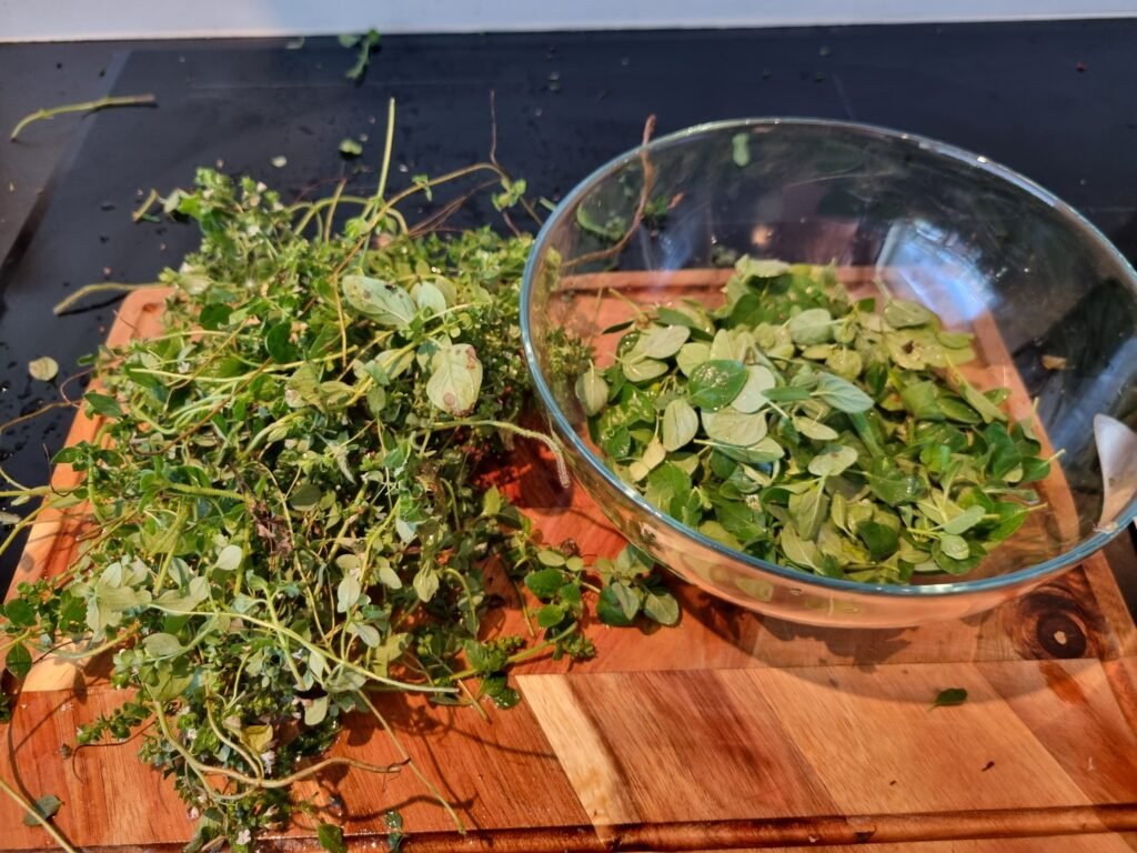 Det anbefales på det sterkeste å gjøre dette før oreganoen blomstrer, det vil korte ned på tiden du bruker, betydelig. Skyll bladene raskt og tørk dem godt. Hakk bladene grovt, eller legg de rett i posen. Etter nitidig plukking valgte jeg den enkleste metoden. Legg oreganoen i en bolle og vend den med en liten mengde olje. Et godt forhold er omtrent én spiseskje olje per liter løst pakket oregano.