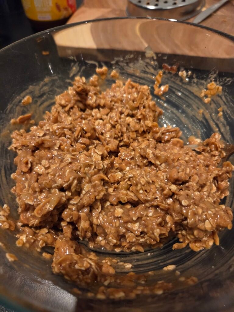 Vend inn finrevet brunost, havregryn, bakepulver, krydder og salt.