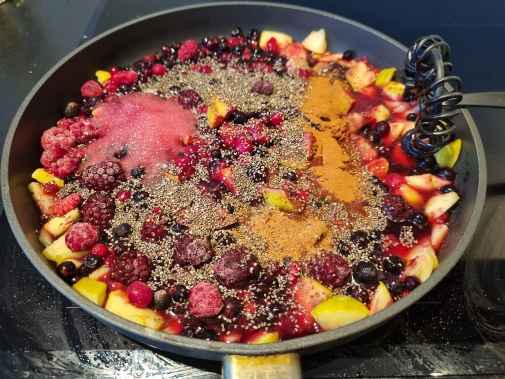 Når du har lyst på noe søtt, friskt og samtidig næringsrikt, er denne bærkompotten med chiafrø et supert valg. Den kombinerer syrligheten fra Granny Smith-epler med sødmen fra bær og et hint av varme krydder. Resultatet er en frisk kompott som passer like godt til frokost som til dessert.