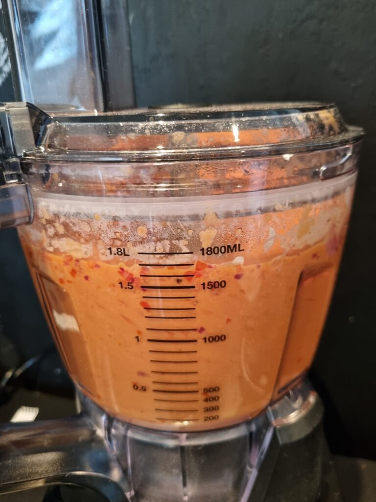 Ta formen ut, og kjør de bakte ingrediensene til en jevn suppe. Du kan bruke blender, foodprosessor eller stavmikser. Velg det som passer deg best. Tilsett eventuelt litt ekstra væske hvis du ønsker en tynnere konsistens.