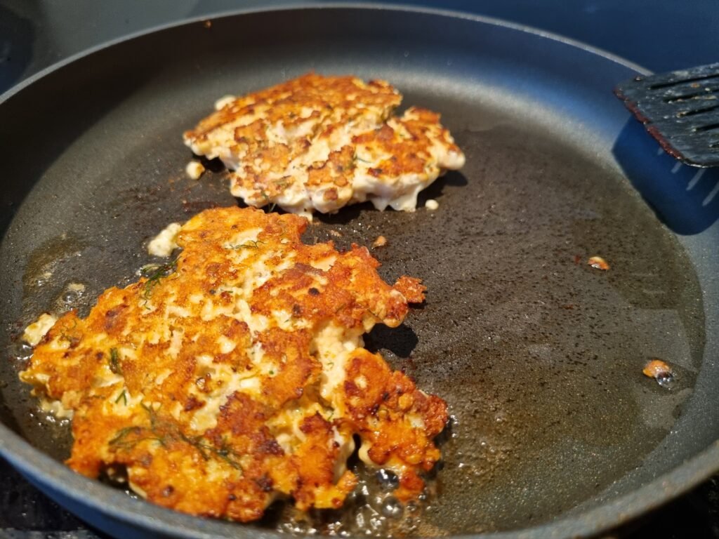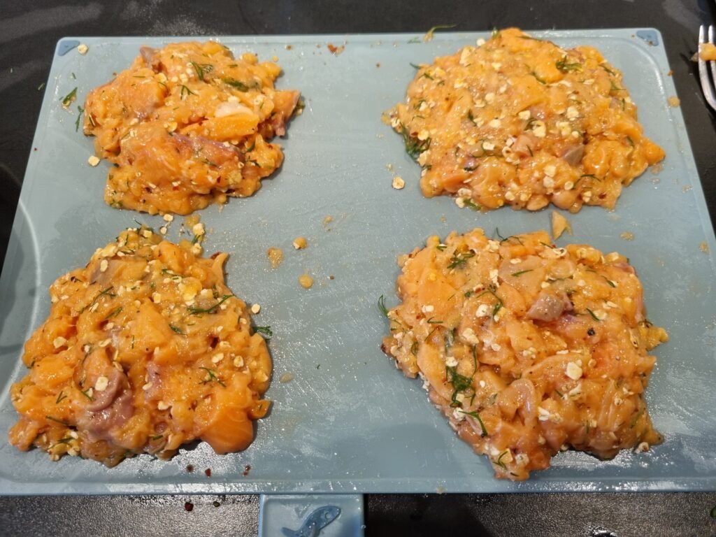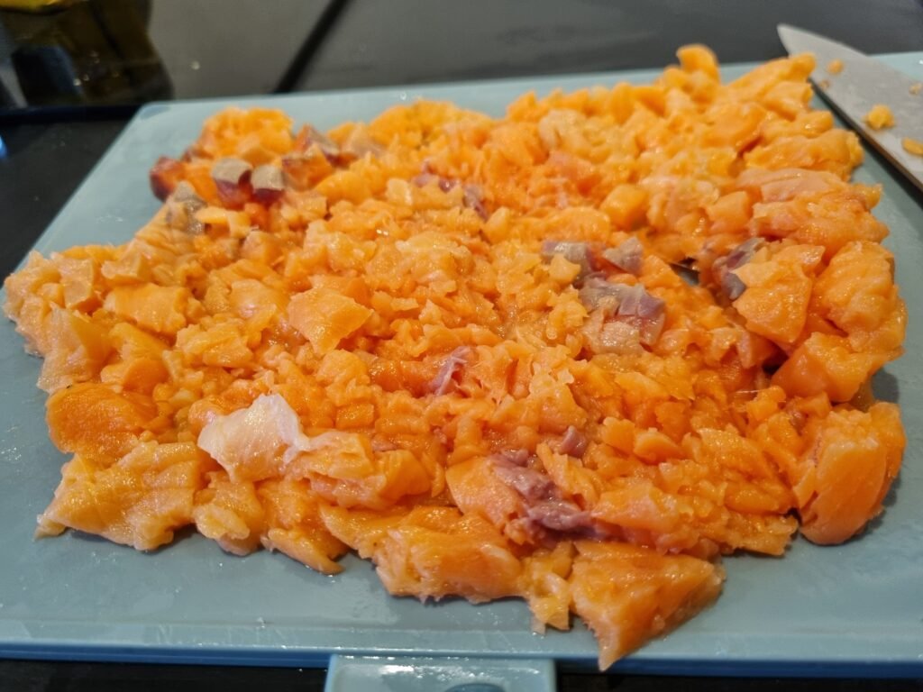Tin fisken i kjøleskap, gjerne natten over, eller finn ut at klokka er 18 og du har lyst på middag nå. Da funker det med et vannbad i en bolle. Når den er helt (godt nok) tint, hakkes laksen grovt med kniv eller kjøres raskt i food processor. Ikke la farsen bli helt jevn, den skal ha litt struktur. Etter en tidligere tabbe, sikra jeg meg selv med å hakke med kniv.