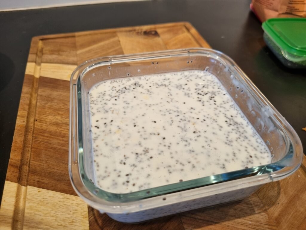 Bland alt i et glass eller en bolle med lokk. Rør godt slik at chiafrøene ikke klumper seg. Sett i kjøleskapet over natten, og neste morgen er grøten klar.