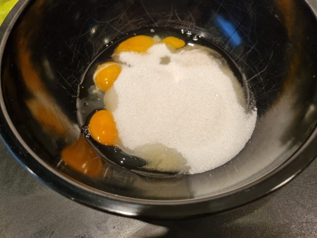 Start med å piske egg og sukker til en luftig eggedosis. Viss noen lurer, så har stavmikseren til Smeg innstillingene litt for fort, og veldig for fort til å piske det her i en åpen bolle … Dette er selve grunnlaget for at kaken blir lett og saftig. Bland sammen mel og bakepulver og vend det forsiktig inn i eggedosisen. Tilsett det smeltede smøret og rør til røren er jevn.