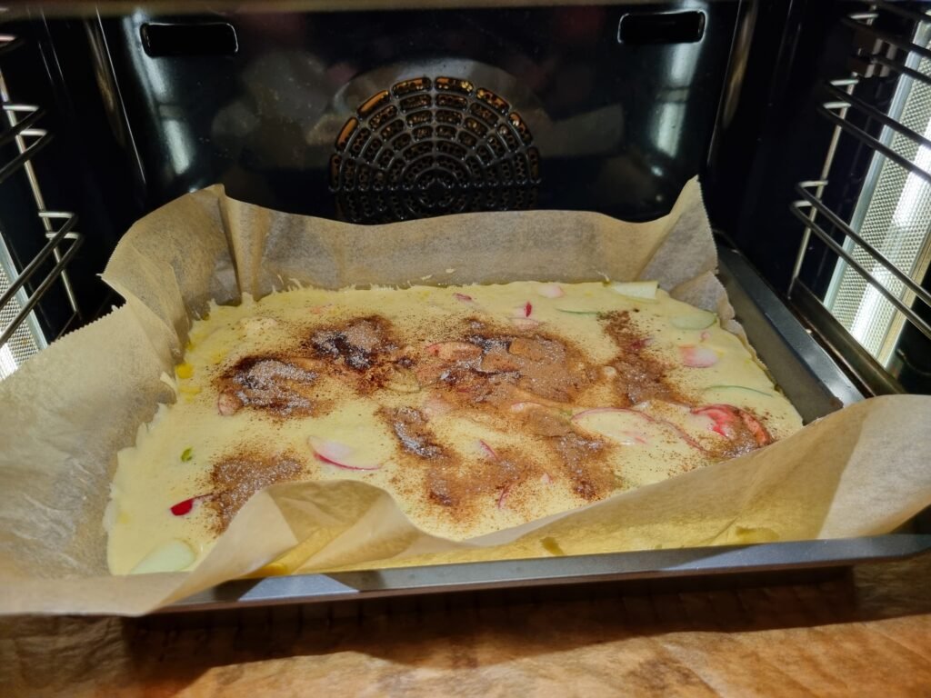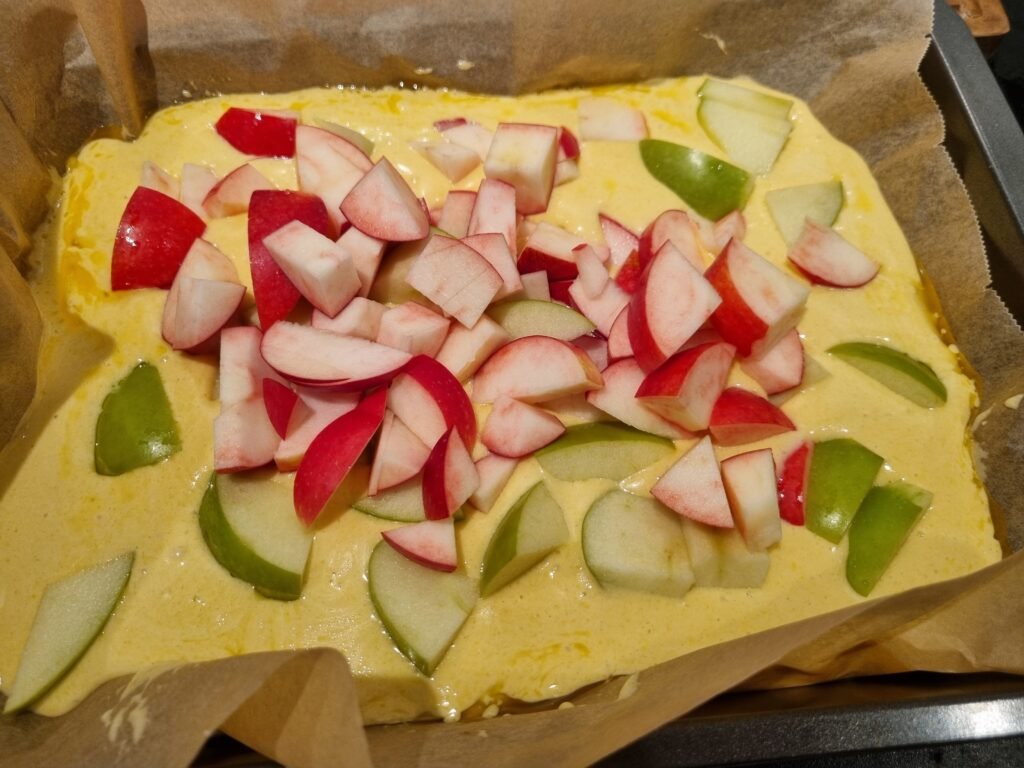 Det er valgfritt å skrelle eplene, og siden jeg er lat, så ble skallet på. Skjær eplene i båter eller skiver. Ha i bakepapir eller smør en liten langpanne på omtrent 20×30 cm og hell i røren. Legg eplene på toppen og dryss over et godt lag sukker og kanel. Bare pass på at det ikke kommer for mye kanel på en gang.