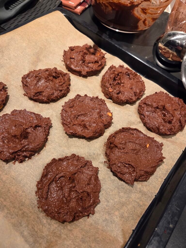 Jeg gjorde derfor noen små, bevisste justeringer. Litt mindre fukt, litt mer struktur, kakao for å forsterke browniesmaken, og honning i stedet for lønnesirup, rett og slett fordi jeg hadde det i skapet. Resultatet ble akkurat det jeg håpet på: myke cookies med tydelig sjokoladesmak, som setter seg fint når de kjøler seg ned.